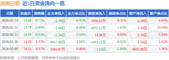 证券之星消息,截至2026年2月13日收盘,湖南白银(002716)报收于13.68元,下跌0.73%,换手率10.89%,成交量253.1万手,成交额34.56亿元。