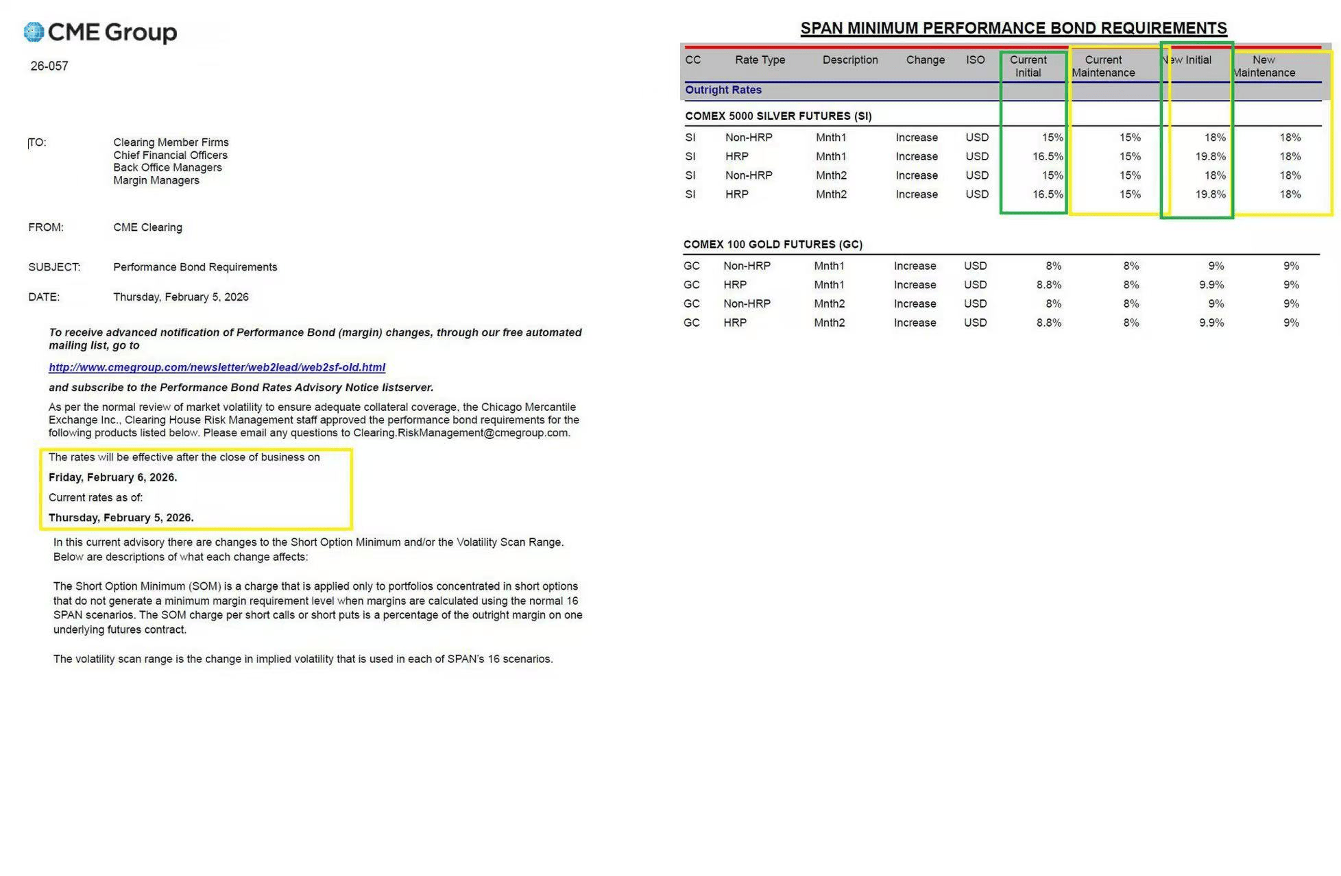 1月27日,CME宣布对旗下白银、钯、铂三大金属期货产品的履约保证金进行全面上调,白银类产品是此次调整的重点。其中,非高风险组合(Non-HRP)保证金从原先的9%统一上调至11%,高风险组合(HRP)保证金则从9.9%上调至12.1%。