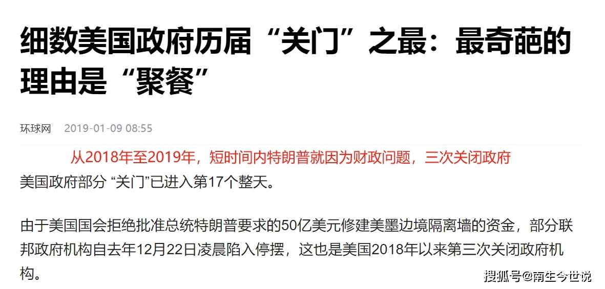 那下一次呢?若有几个党内的反对者倒戈,那特朗普政府又要面临“临时关门”的危机。请注意“又要”两个字,因为在特朗普的前一个任期内“他的政府曾在短时间三次因财政问题而被迫暂停运营”。