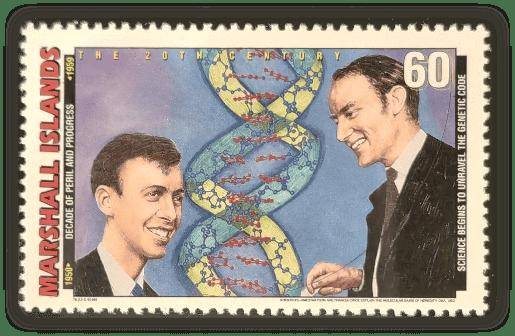 马绍尔群岛(1999):沃森(右)、克里克(左)和DNA双螺旋结构模型,二人对分子生物学的热忱深深影响了吉尔伯特,让他决心转向生命科学研究,不仅改写了自身学术道路,也深刻影响了这一领域的发展