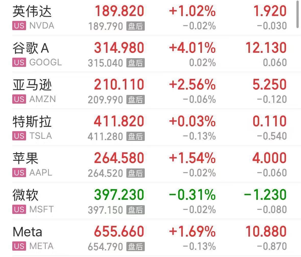 大型科技股多数上涨,谷歌涨超4%,亚马逊涨超2%,英伟达、苹果、Meta涨超1%,特斯拉上涨0.03%,微软下跌0.31%。
