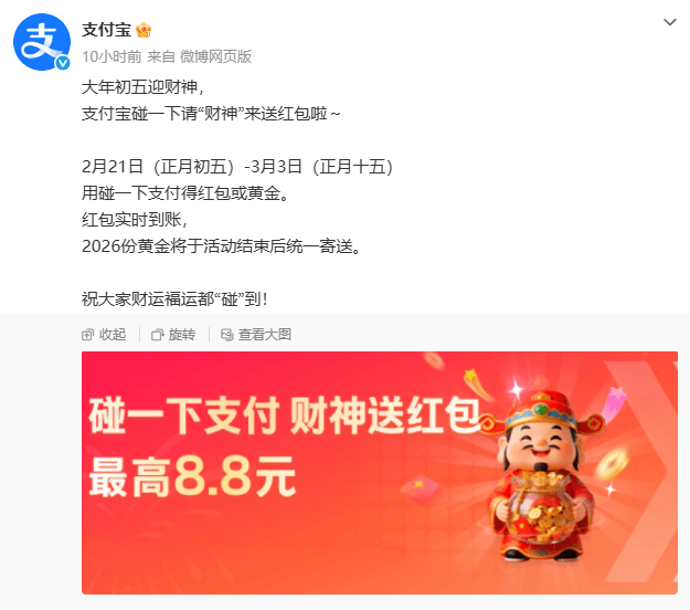 大年初五迎财神,支付宝宣布2月21日(正月初五)-3月3日(正月十五)用碰一下支付得红包或黄金。红包实时到账,2026份黄金将于活动结束后统一寄送。