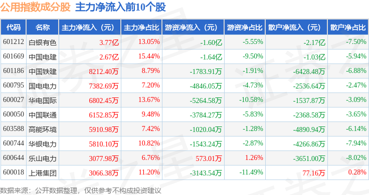 资金流向方面,公用指数(000007)成份股当日主力资金净流入合计6.96亿元,游资资金净流出合计7.96亿元,散户资金净流入合计1.0亿元。成份股资金流向详情见下表: