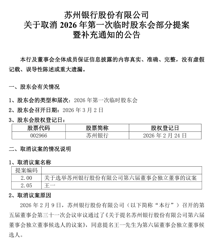此次调整的缘起,可追溯至2026年2月9日。当日,苏州银行召开第五届董事会第三十一次会议,审议通过提名第六届董事会独立董事候选人的相关议案,并在后续发布的股东大会通知中,将选举王一先生为独立董事的提案纳入会议议程。然而,在2026年第一次临时股东大会召开前夕,相关议程出现调整。2月26日,苏州银行收到王一先生提交的《告知函》,其因个人原因,拟不再参与该行独立董事的选举。