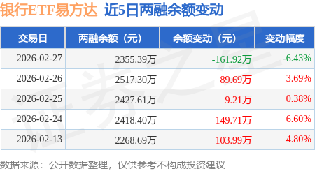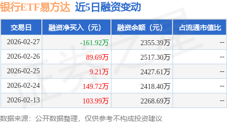 证券之星消息,2月27日,银行ETF易方达(516310)融资买入337.86万元,融资偿还499.78万元,融资净卖出161.92万元,融资余额2355.39万元,近20个交易日中有12个交易日出现融资净买入。