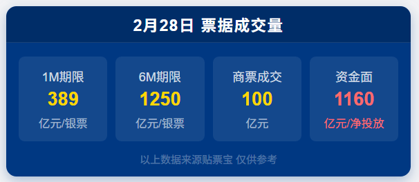① 中国央行今日开展190亿元7天逆回购操作,投标量190亿元,中标量190亿元,操作利率为1.40%,贴票宝数据显示,今日无逆回购到期。②人民币兑美元中间价报6.9236,下调8点;上一交易日中间价6.9228,上一交易日官方收盘价6.8559,上日夜盘报收6.8630。③ 查询银行承兑汇票、财务票和商业承兑汇票的贴现利率请在贴票宝官网查询,计算贴现利率和查询开户行行号请用贴票宝计算器;