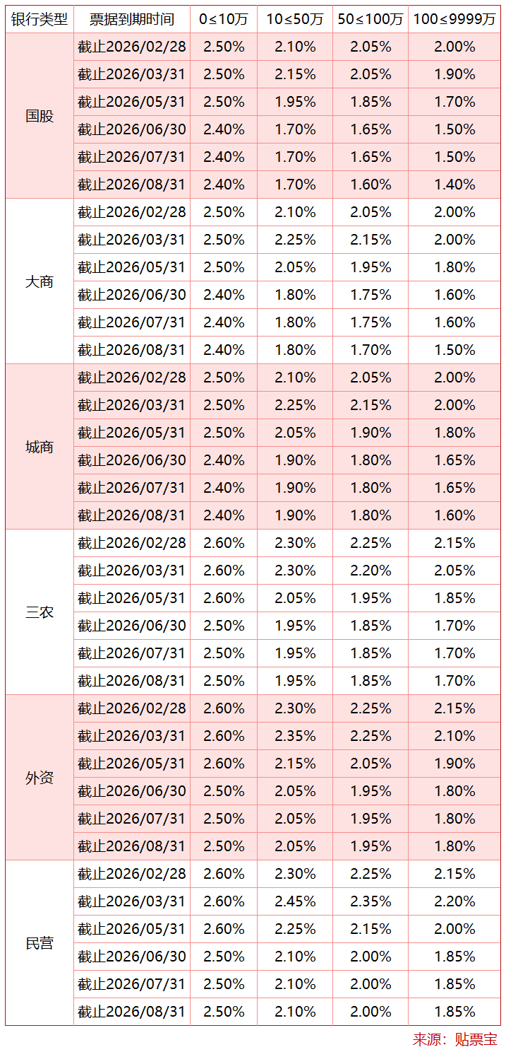 以下为2026年3月2日的银行承兑汇票贴现利率报价表(来源贴票宝)