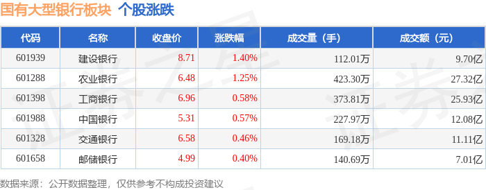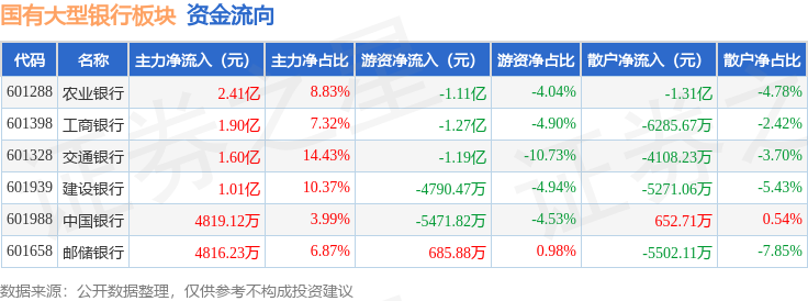 从资金流向上来看,当日国有大型银行板块主力资金净流入7.88亿元,游资资金净流出4.52亿元,散户资金净流出3.36亿元。国有大型银行板块个股资金流向见下表: