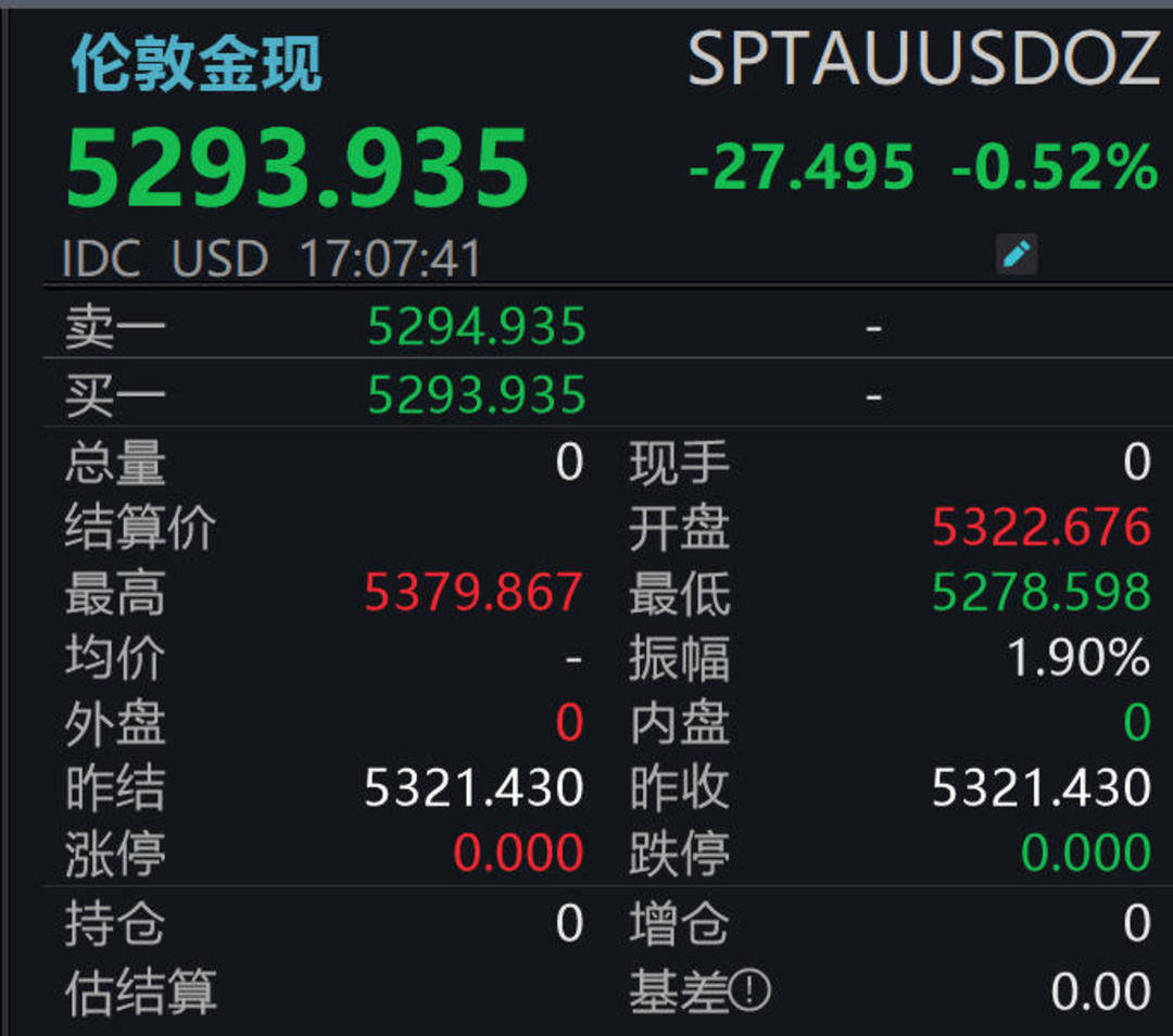 Wind数据显示,截至发稿,伦敦金现价格为5293.9美元/盎司,下跌0.52%;伦敦银现价格为84.7美元/盎司,下跌5.08%。