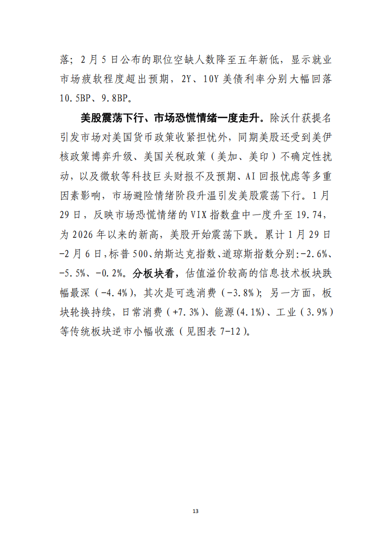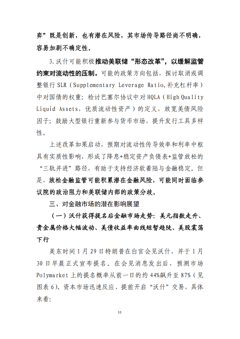 沃什获提名后,金融市场快速反应,美元指数短暂走升,贵金属价格大幅波动,美债收益率曲线短暂趋陡,美股震荡下行且板块分化显著。展望后续市场,美元指数进一步走强空间有限,但沃什的政策主张或修复美元信用,缓解去美元化压力;美债收益率曲线将延续陡峭化走势,短端利率随降息预期进一步下行;美股虽受经济韧性与降息预期支撑,但波动和板块分化将加剧,资金对稳健价值股的偏好上升,科技板块面临估值调整压力,金融监管放松预期则利好金融板块。