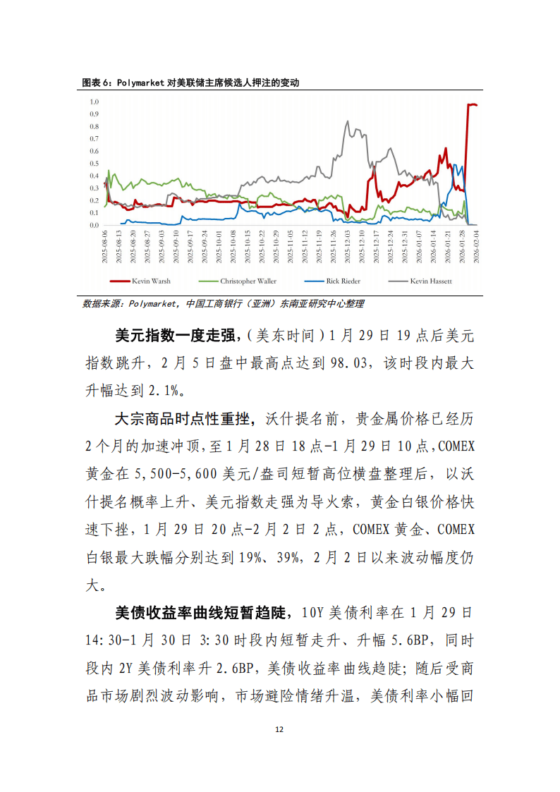 2026年1月凯文·沃什被提名接任美联储主席后,市场迅速形成“沃什交易”,工银亚洲研究指出,尽管沃什过往政策立场偏鹰,强调通胀锚定、反对量化宽松常态化,但在多重市场背景下,其政策出现温和“鸽派倾斜”的概率较高,同时其政策取向也将对全球金融市场产生多维度影响。