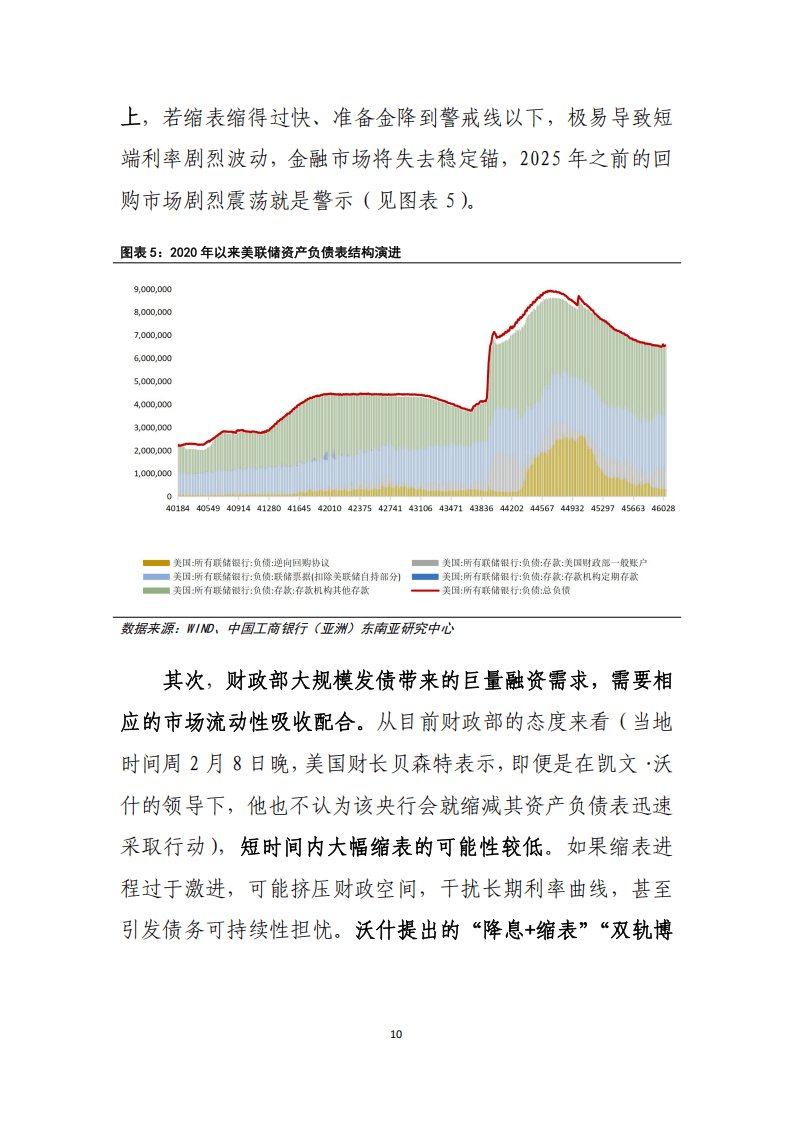 前瞻美联储后续政策,利率路径上,受全球降息周期、美国就业市场趋弱、通胀回落等因素影响,预计2026年6月重启降息,全年降息2次共50个基点,沃什虽信奉纪律化利率模型,但政策鸽派倾斜可能性上升;资产负债表方面,沃什提出缩表的核心是恢复美联储工具使用的纪律与边界,而非快速压缩资产规模,在美债回购市场与流动性高度绑定的背景下,量化紧缩将长期渐进推进,其还主张通过“降息+缩表”的组合拳推动经济再平衡,同时或推动美联储监管形态改革,探索放松部分金融监管以提升流动性传导效率。