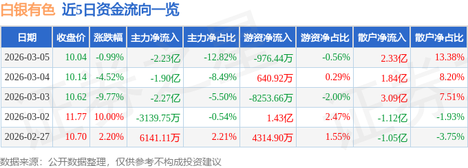 证券之星消息,截至2026年3月5日收盘,白银有色(601212)报收于10.04元,下跌0.99%,换手率2.33%,成交量172.56万手,成交额17.41亿元。