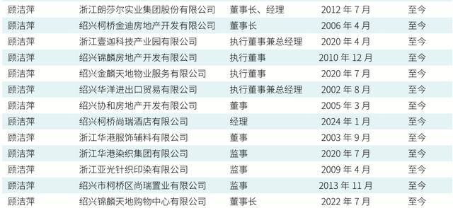 据瑞丰银行2024年年报,顾洁萍,1974年11月出生,中国国籍,研究生学历,中共党员,高级经济师。历任浙江省租赁公司员工,浙江华港染织有限公司总经理,本行监事。现任浙江朗莎尔维迪制衣有限公司总经理,浙江朗莎尔实业集团股份有限公司董事长,浙江壹迦科技产业园有限公司总经理,本行董事。