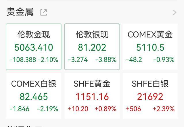 3月9日,现货黄金、现货白银下挫,截至7:43,现货黄金向下跌破5100美元,日内下跌2.1%。现货白银跌3.88%,报81.202美元/盎司。