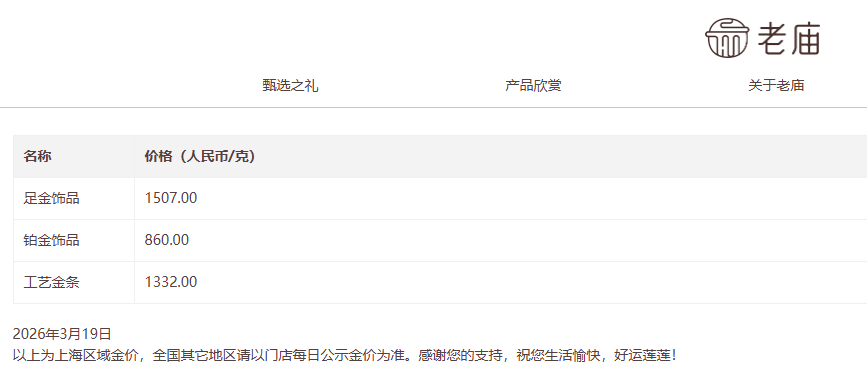 老庙黄金金饰1507元/克,单日下跌43元。