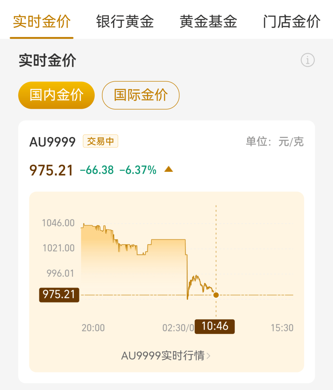 3月23日,开盘不到3分钟,国内金价跌破1000元。截至发稿,报975.21元/克。