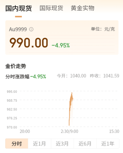 3月23日,开盘不到3分钟,国内金价跌破1000元。截至发稿,报990元/克。