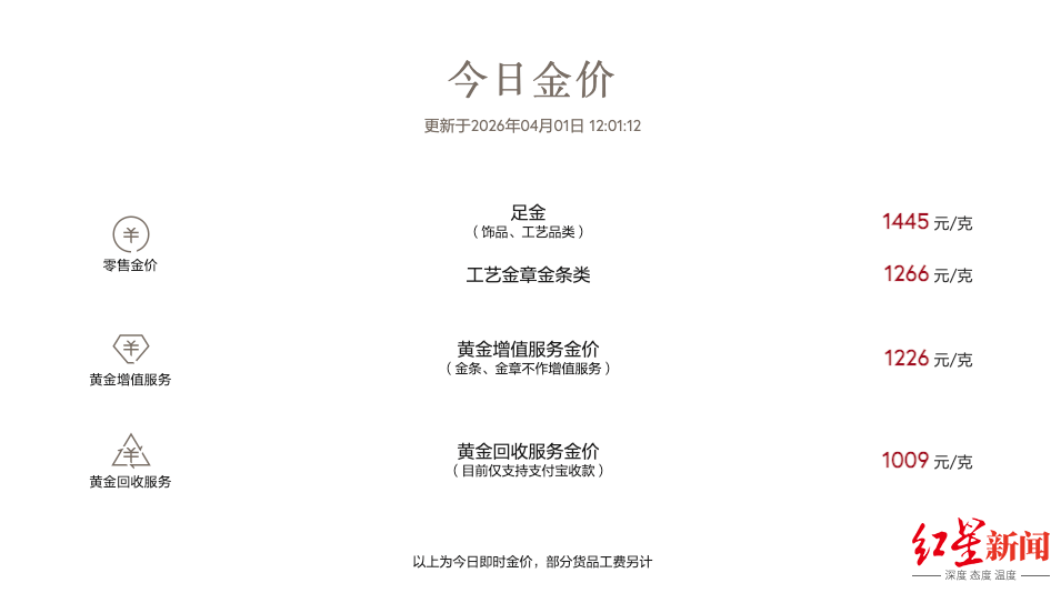 国内金饰价格同样迎来大涨。红星新闻记者注意到,4月1日各大品牌金饰价格普遍在每克1440-1450元区间,与前一天相比上涨约每克50元。
