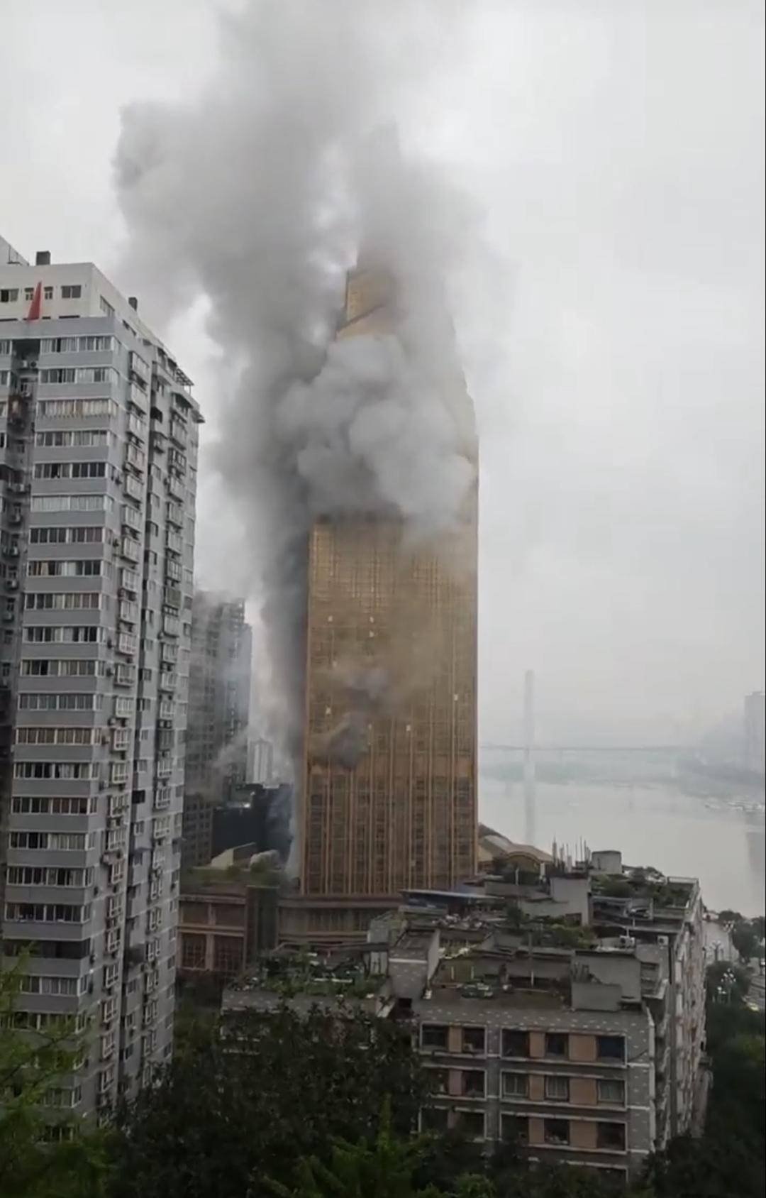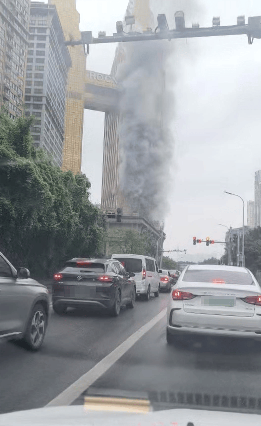 4月3日,网传视频称重庆市南岸区“黄金双塔”发生火情。视频显示,一栋通体金色的高层建筑外冒起滚滚浓烟,大楼被浓烟笼罩。