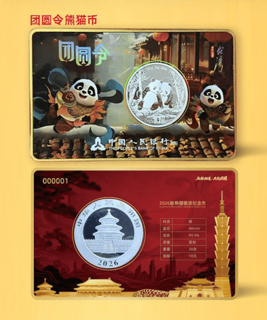《团圆令熊猫银币装帧卡》的问世,不仅有效延展了优秀文化作品的产业链条,更以市场化文创为纽带,将“两岸一家亲”的核心理念融入大众生活,搭建起两岸同胞情感交融、心灵相通的全新桥梁。它既是一件精美的贵金属典藏珍品,更是承载家国期盼、凝聚民族情感的团圆信物,让中华儿女心底的团圆梦,跨越山海、穿越时光、永久被看见、铭记与传承。