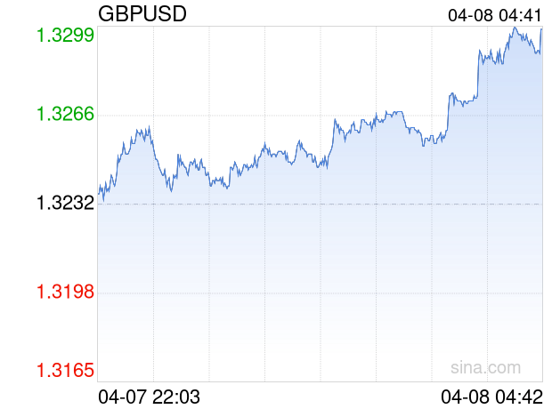 新浪外汇消息2026年04月08日,截至04时41分,外汇市场上英镑兑美元汇率突破1英镑兑换1.3300美元。涨幅为0.5139%