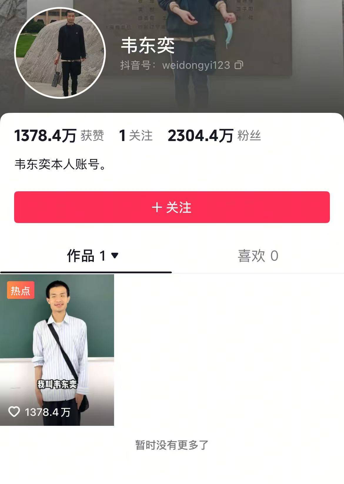 截至6月9日9时30分,韦东奕账号粉丝超2300万