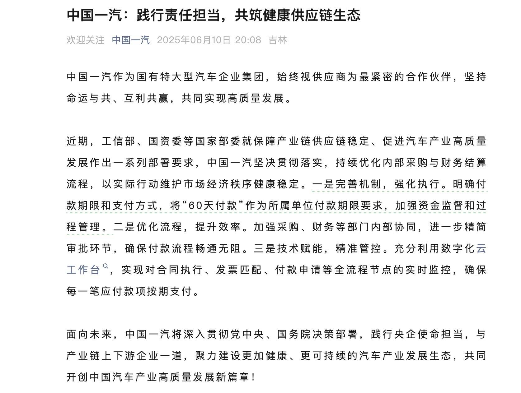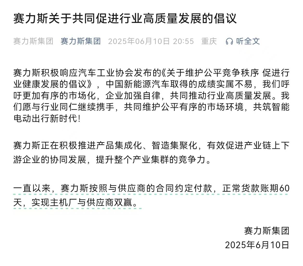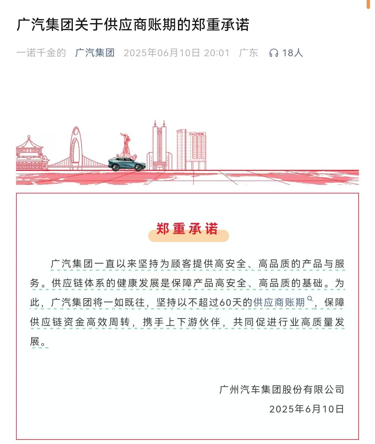 6月10日晚,一汽、东风、广汽、赛力斯相继发文承诺,供应商账期不超过60天。