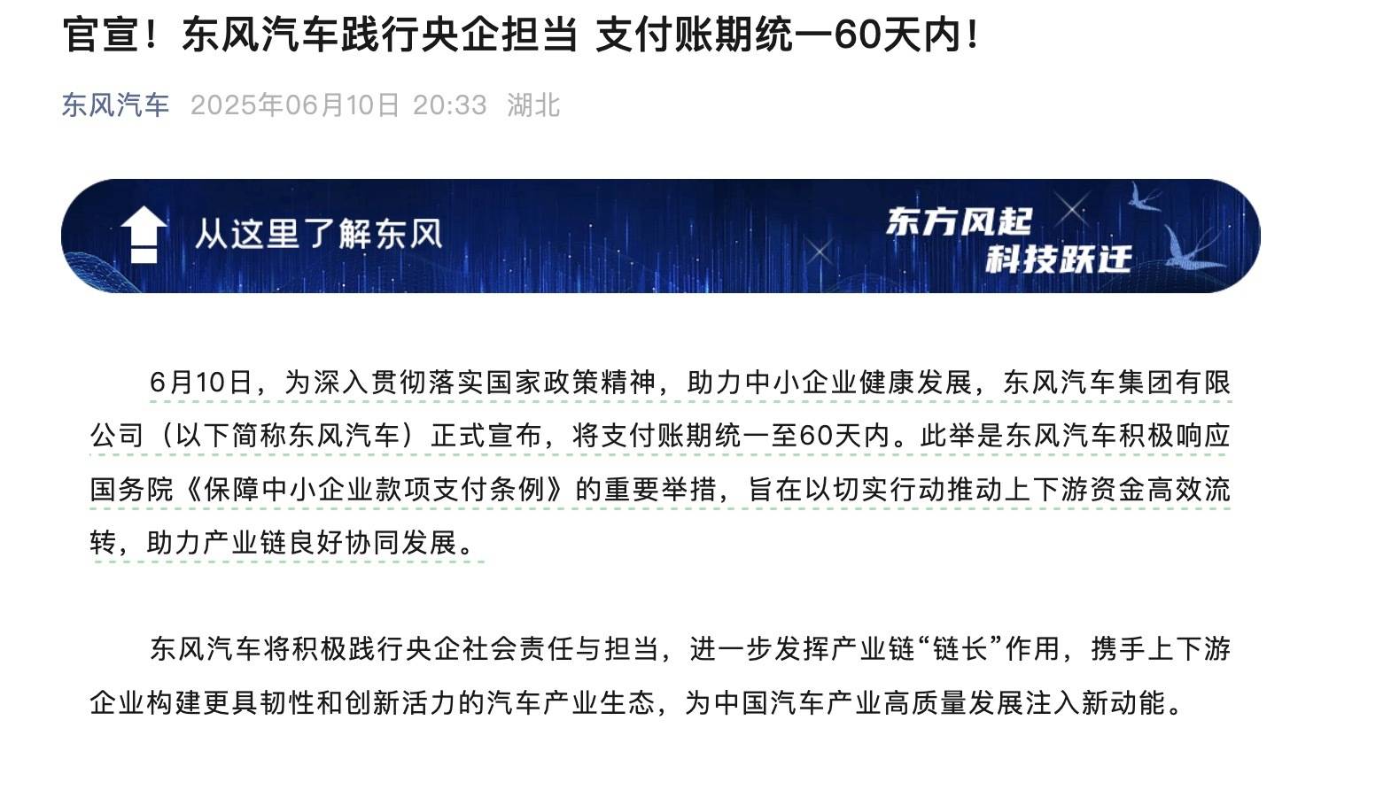 据悉,自2025年6月1日起施行的《保障中小企业款项支付条例》其中提到明确机关、事业单位和大型企业支付中小企业款项的期限要求,增加规定大型企业应当自货物、工程、服务交付之日起60日内支付款项。东风汽车表示,响应举措旨在以切实行动推动上下游资金高效流转,助力产业链良好协同发展。