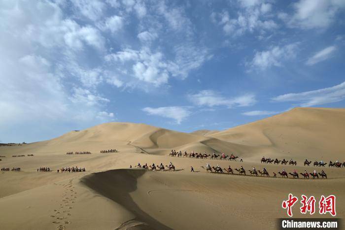 6月7日,游客骑骆驼在敦煌市鸣沙山月牙泉景区游览。张晓亮 摄