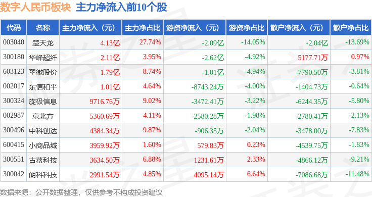 从资金流向上来看,当日数字人民币板块主力资金净流出28.79亿元,游资资金净流出2.18亿元,散户资金净流入30.97亿元。数字人民币板块个股资金流向见下表: