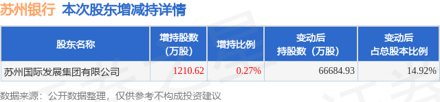 证券之星消息,6月30日苏州银行发布公告《苏州银行:关于大股东及其一致行动人增持公司股份计划的公告》,其股东苏州国际发展集团有限公司于2025年6月27日合计增持1210.62万股,占公司目前总股本的0.2708%,变动期间该股股价下跌2.41%,截止6月27日收盘报8.91元。