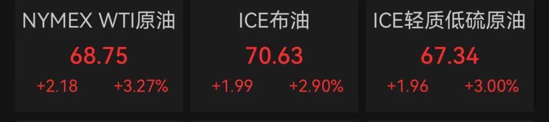 大宗商品方面,国际油价上涨。WTI原油期货上涨1.88美元,报每桶68.45美元,涨幅2.82%;布伦特原油上涨1.72美元,收于70.36美元,涨幅2.51%。