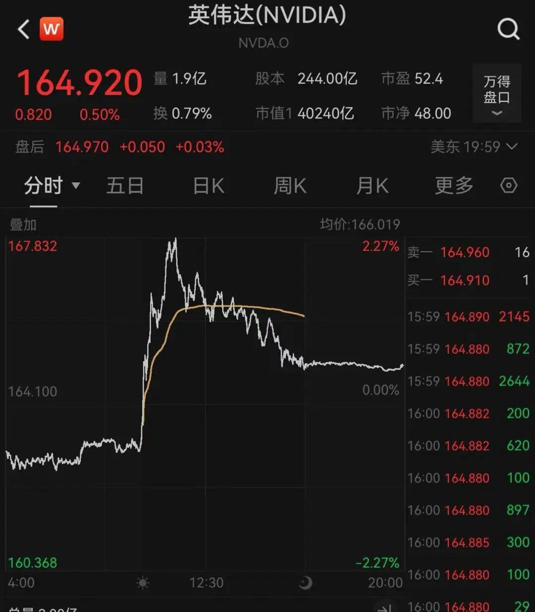 英伟达收涨0.5%报164.92美元,盘中最高报167.89美元,均创历史新高。最新市值为4.022万亿美元。