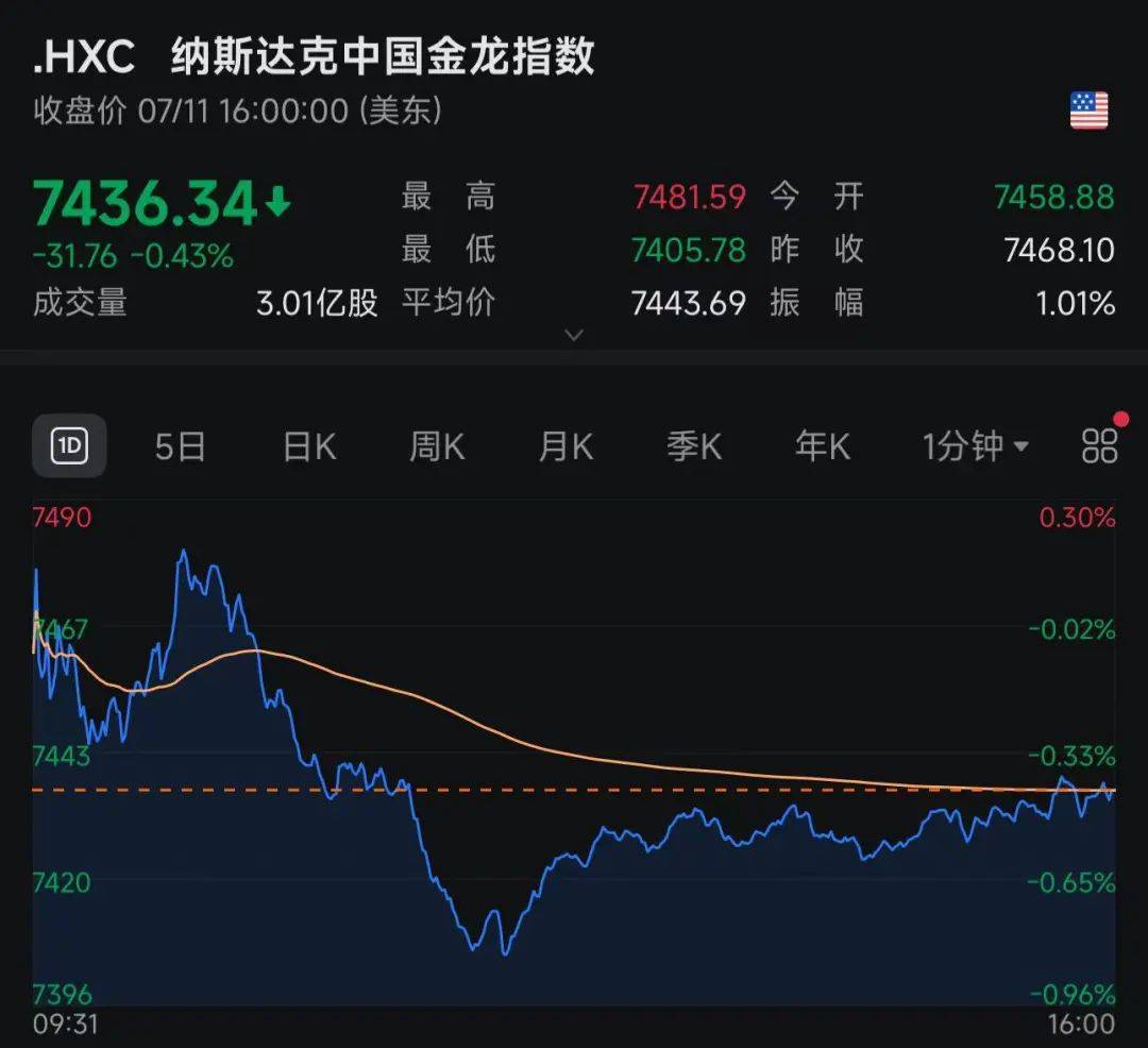 中概股方面,纳斯达克中国金龙指数跌0.43%,本周累涨0.65%。