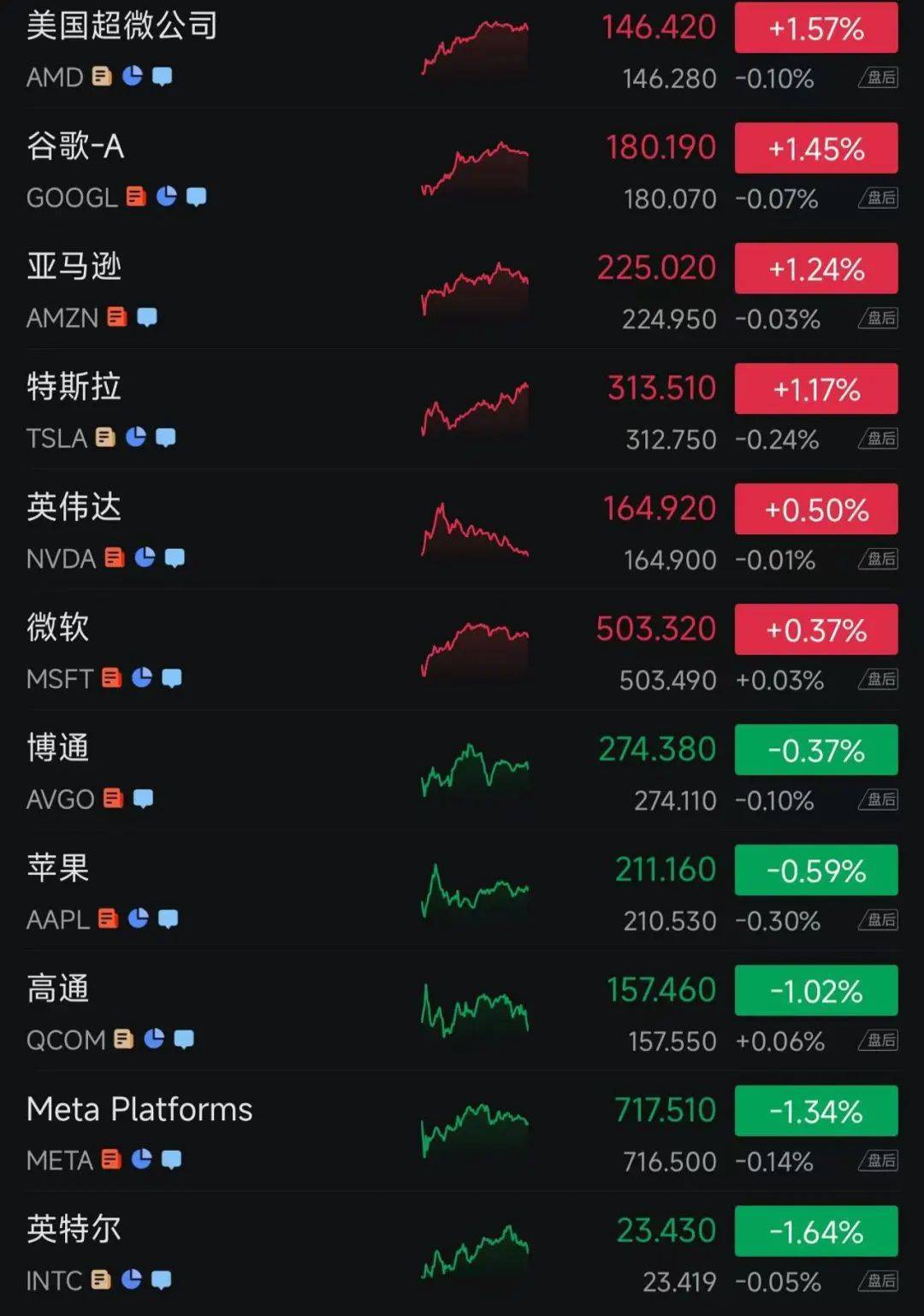 大型科技股涨跌不一,微软涨0.37%,苹果跌0.59%,亚马逊涨1.24%,谷歌A涨1.45%,Meta跌1.34%,博通跌0.37%,特斯拉涨1.17%。