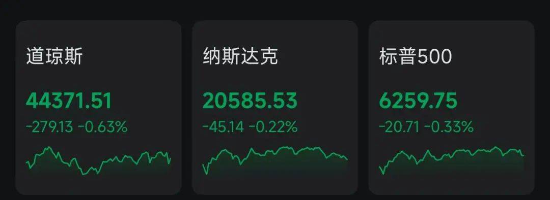 截至收盘,道琼斯指数跌0.63%,报44371.51点;标普500指数跌0.33%,报6259.75点;纳斯达克综合指数跌0.22%,报20585.53点。