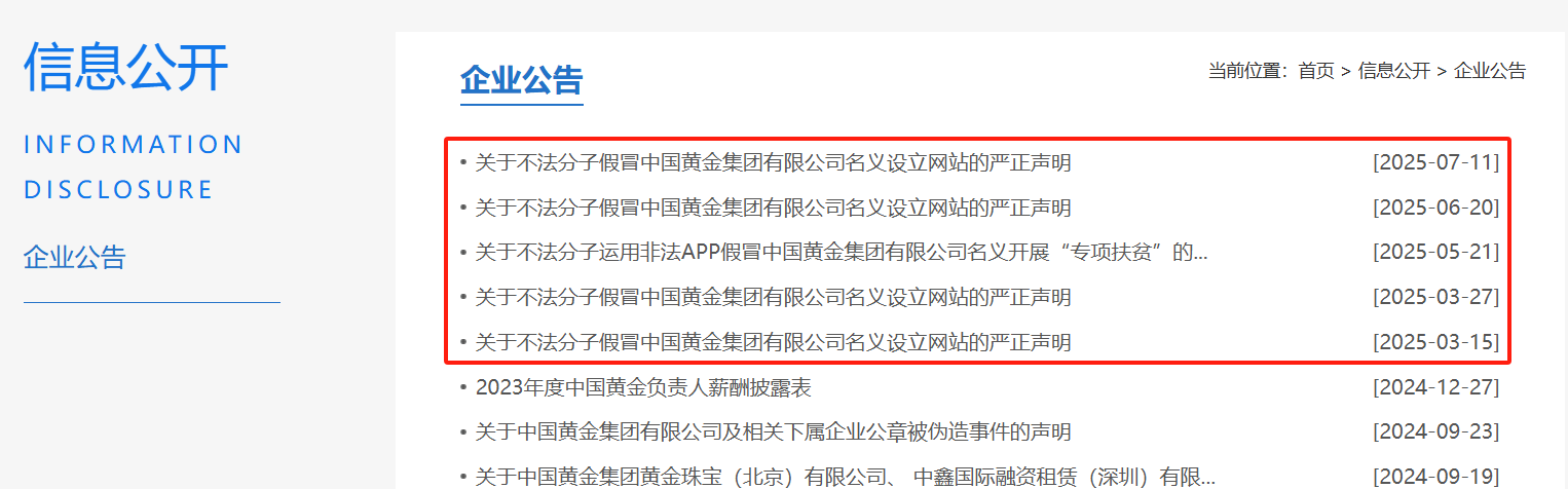 这已经是中国黄金集团今年发布的第五份“打假声明”,其中四份声明均提到有不法分子仿冒中国黄金集团网站,还有一份声明则称不法分子运用非法App假冒中国黄金集团有限公司名义开展“专项扶贫”。
