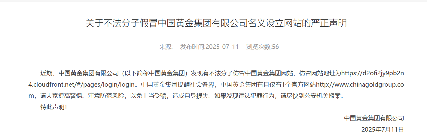 【大河财立方消息】7月11日,中国黄金集团发布声明称,发现有不法分子仿冒中国黄金集团网站。中国黄金集团提醒社会各界,集团有且仅有1个官方网站,请大家提高警惕、注意防范风险,以免上当受骗,造成自身损失。如果发现违法犯罪行为,请尽快到公安机关报案。