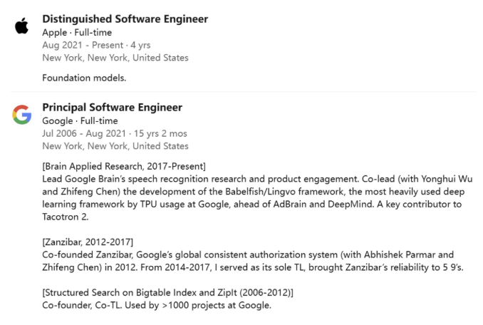 2006年,庞若鸣加入谷歌母公司Alphabet,工作15年,担任首席软件工程师。2021年,庞若鸣加入苹果,负责基础模型(AFM)团队,带领百人团队研发苹果自研大语言模型。