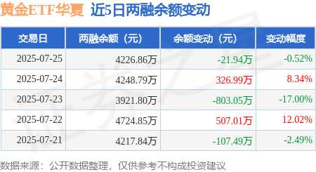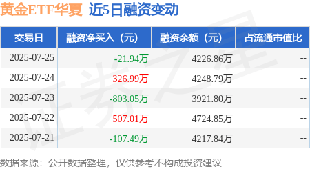 证券之星消息,7月25日,黄金ETF华夏(518850)融资买入1059.53万元,融资偿还1081.47万元,融资净卖出21.94万元,融资余额4226.86万元。