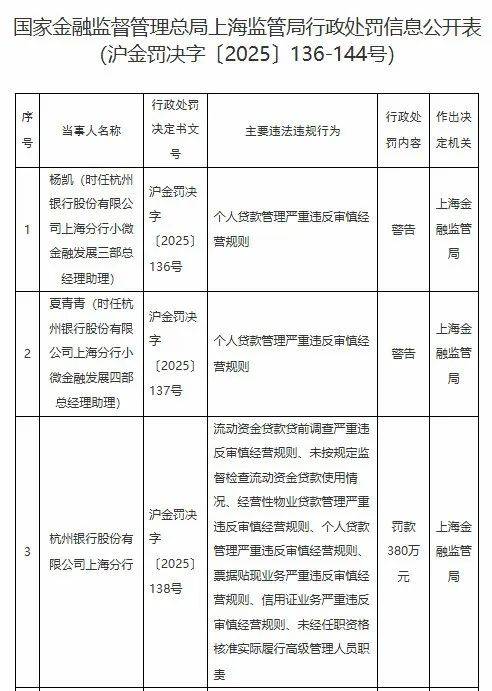 值得注意的是,就在7月初,杭州银行上海分行领到一张百万元级别的大额罚单,七名责任人同步受罚。