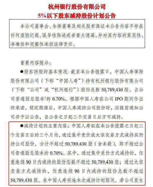 7月15日,杭州银行发布公告称,中国人寿拟在公告披露之日起三个交易日后的三个月内,通过集中竞价或大宗交易方式减持其所持杭州银行股份,合计不超过5078.943万股(含本数),即不超过杭州银行普通股总股本的0.70%。
