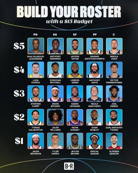 经典的15美元组建阵容,我会选约基奇、浓眉、库里、杜兰特、布伦森。