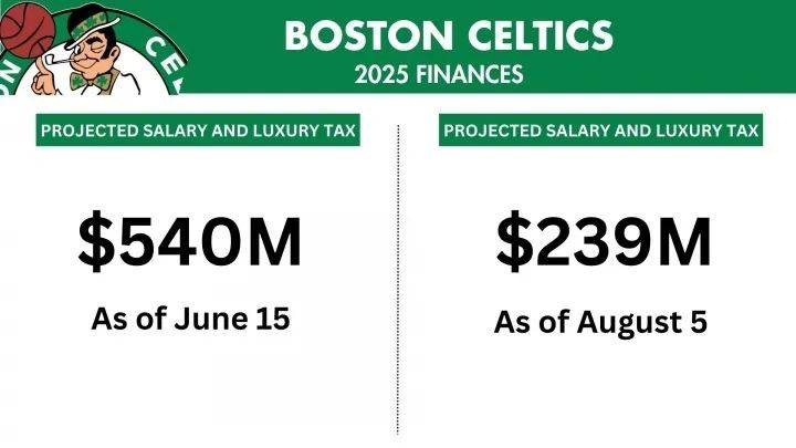 凯尔特人将尼昂和未来两个次轮签送往爵士换来新秀小RJ-路易斯,再省一笔钱。在6月15日,凯尔特人的薪资加上奢侈税高达5.4亿美元。经过51天的操作,现在球队薪资+奢侈税降至2.39亿美元,省了3.01亿美元。