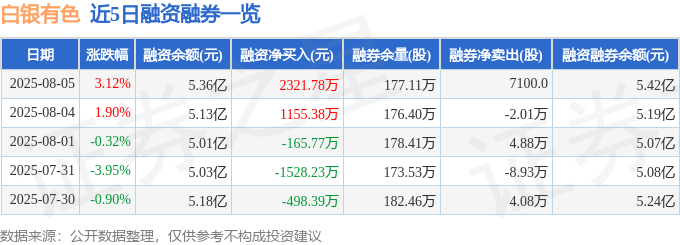 白银有色融资融券信息显示,融资方面,当日融资买入6720.9万元,融资偿还4399.11万元,融资净买入2321.78万元。融券方面,融券卖出5.6万股,融券偿还4.89万股,融券余量177.11万股,融券余额586.23万元。融资融券余额5.42亿元。