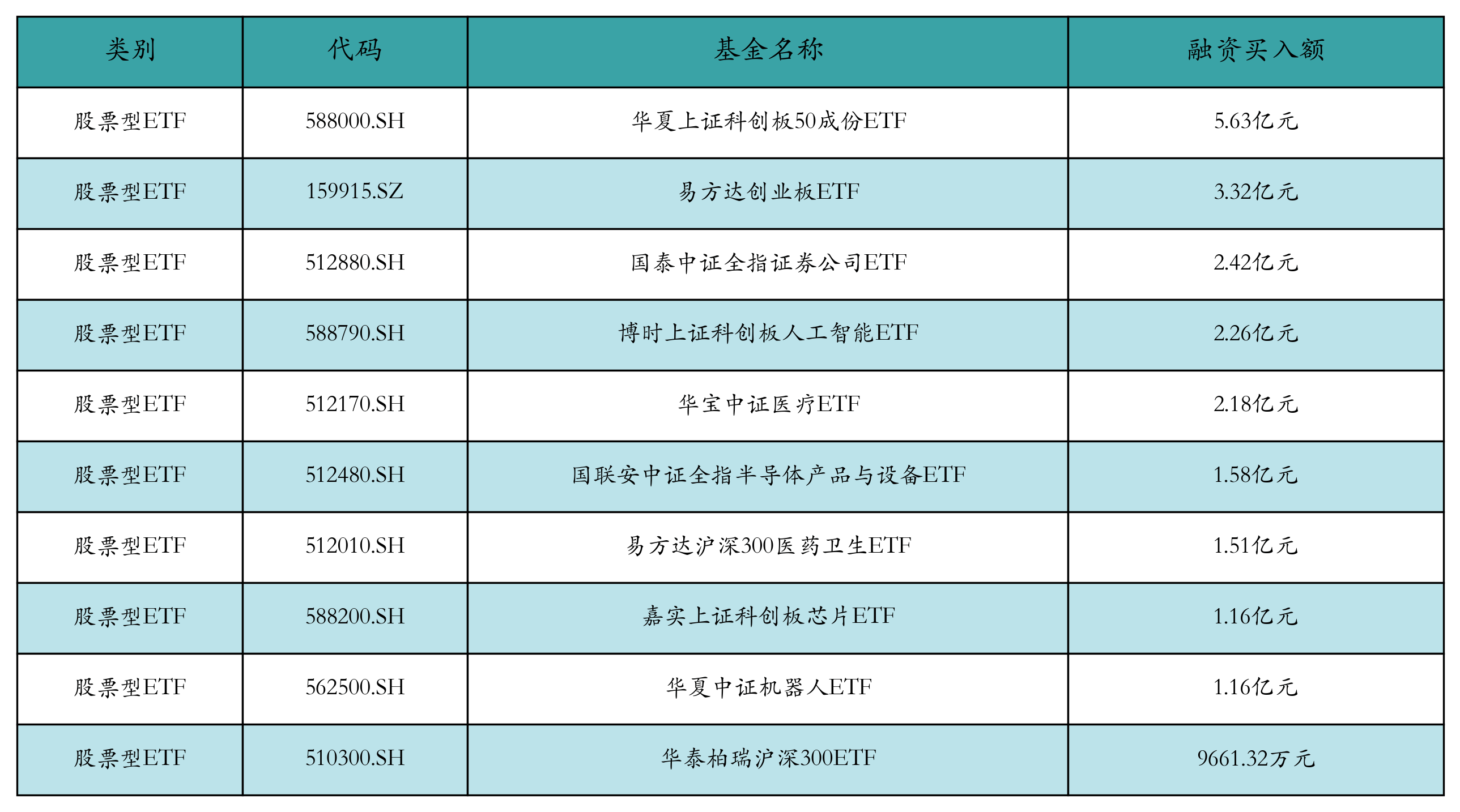 昨日股票型ETF融资买入额最高的3只ETF及其买入金额分别为:华夏上证科创板50成份ETF(5.63亿元)、易方达创业板ETF(3.32亿元)、国泰中证全指证券公司ETF(2.42亿元)。融资买入额前10详情见下表: