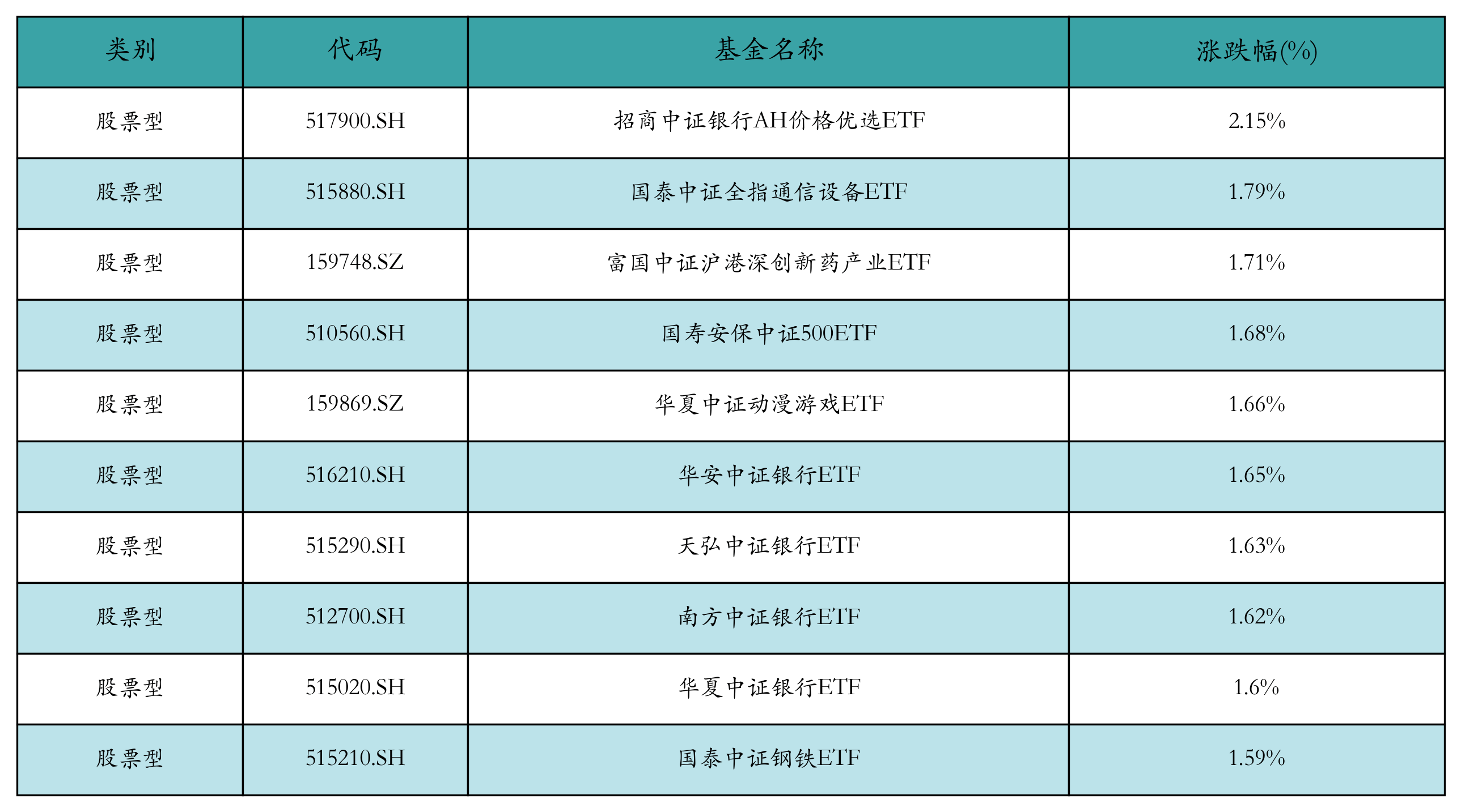 昨日股票型ETF涨幅最高的3只ETF及其收益率分别为:招商中证银行AH价格优选ETF(2.15%)、国泰中证全指通信设备ETF(1.79%)、富国中证沪港深创新药产业ETF(1.71%)。涨幅前10详情见下表: