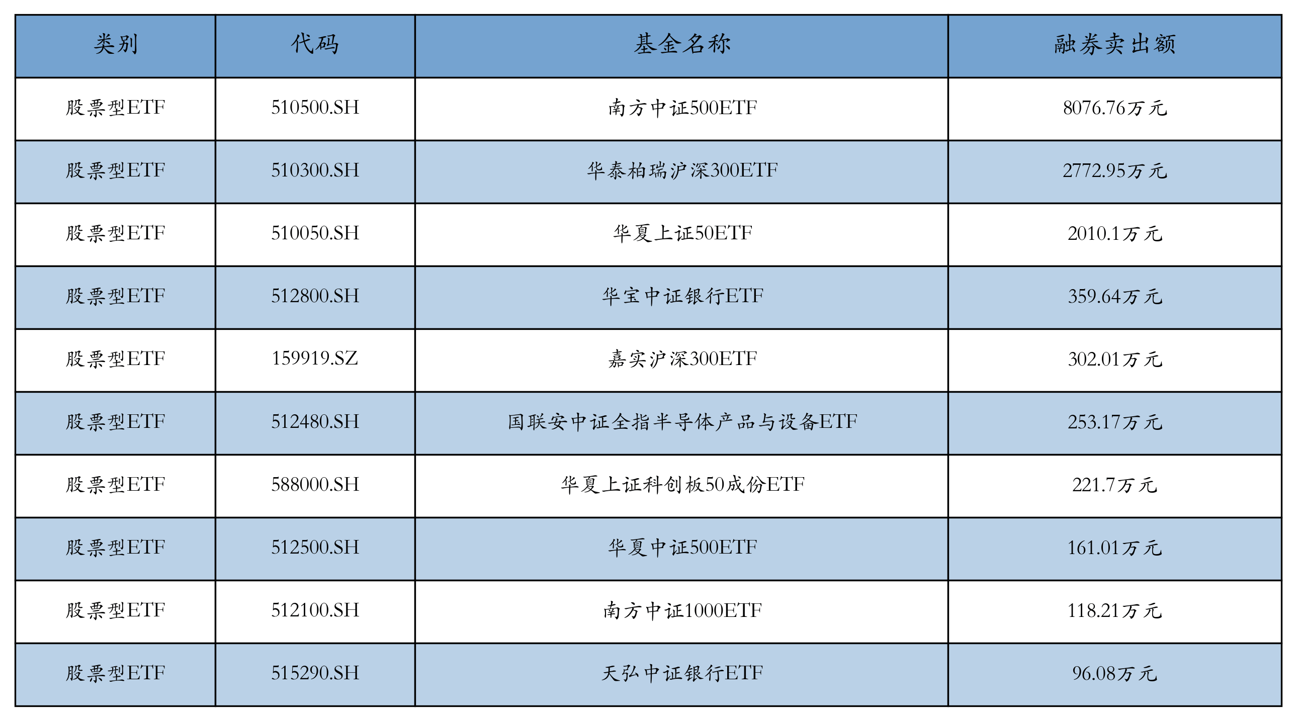 昨日股票型ETF融资卖出额最高的3只ETF及其卖出金额分别为:南方中证500ETF(8076.76万元)、华泰柏瑞沪深300ETF(2772.95万元)、华夏上证50ETF(2010.1万元)。融券卖出额前10详情见下表: