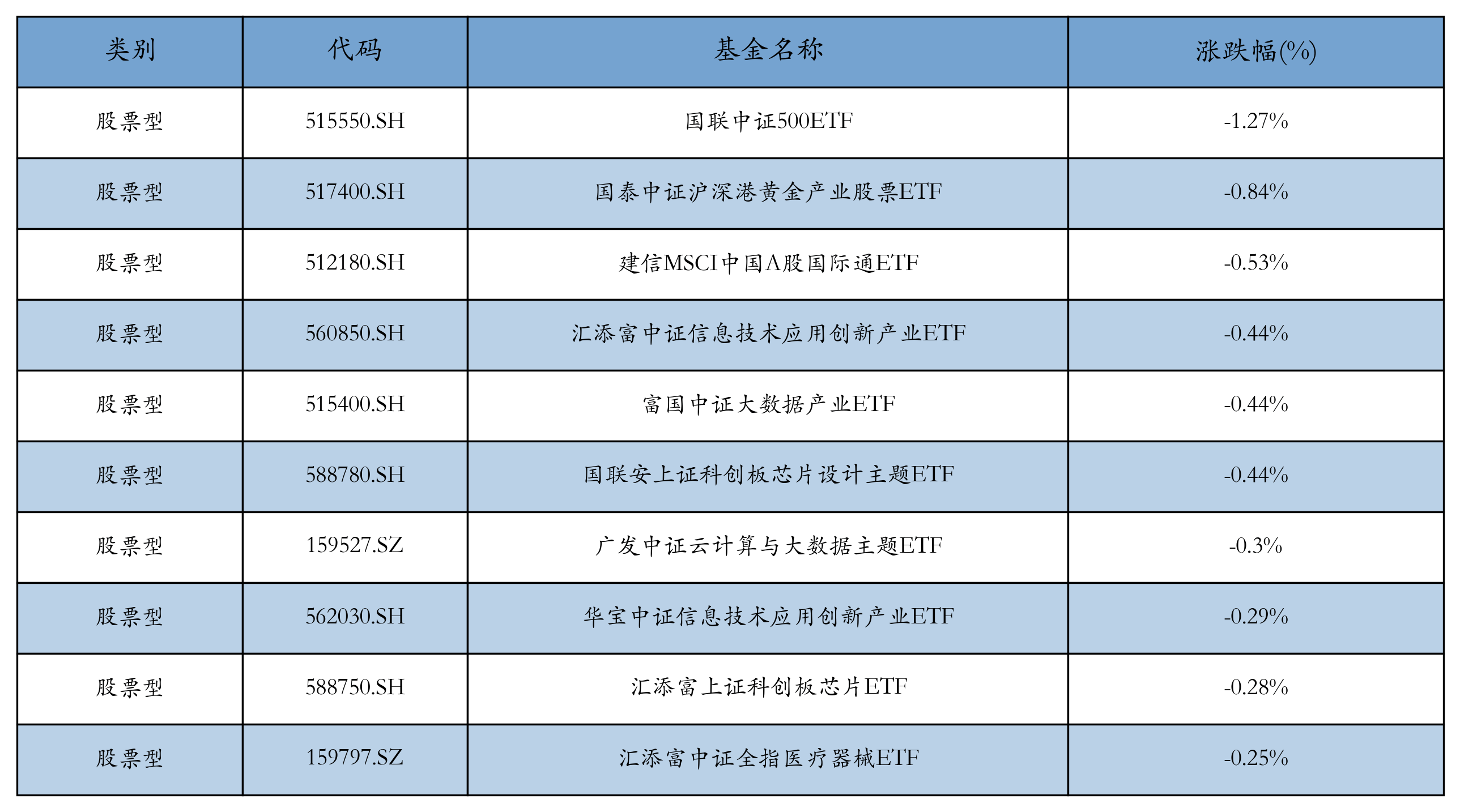昨日股票型ETF跌幅最大的3只ETF及其收益率分别为:国联中证500ETF(-1.27%)、国泰中证沪深港黄金产业股票ETF(-0.84%)、建信MSCI中国A股国际通ETF(-0.53%)。跌幅前10详情见下表: